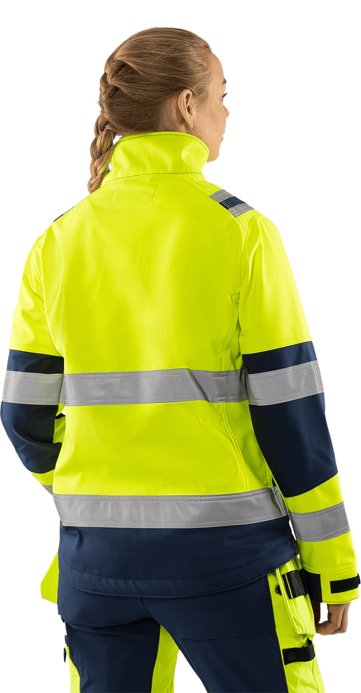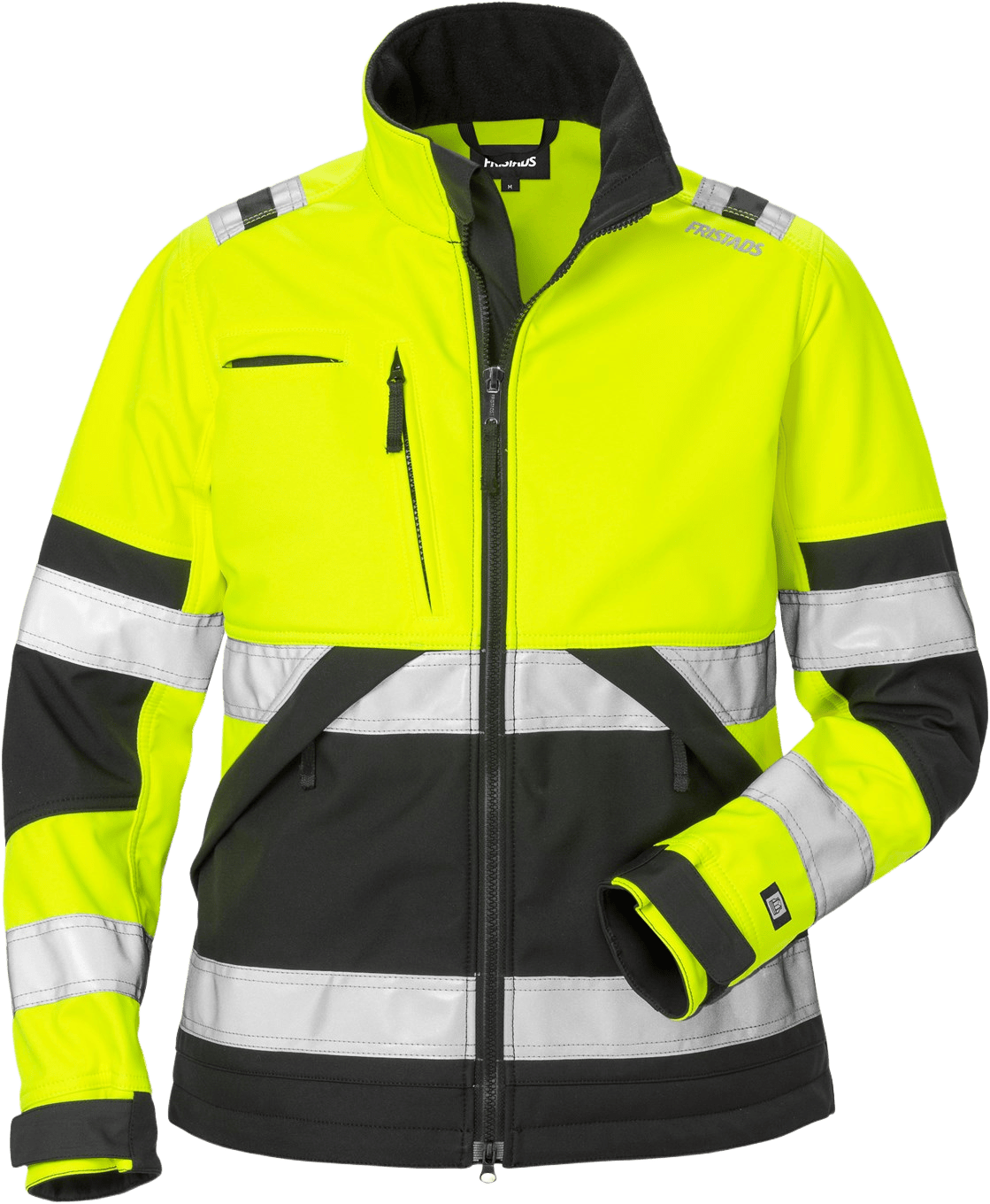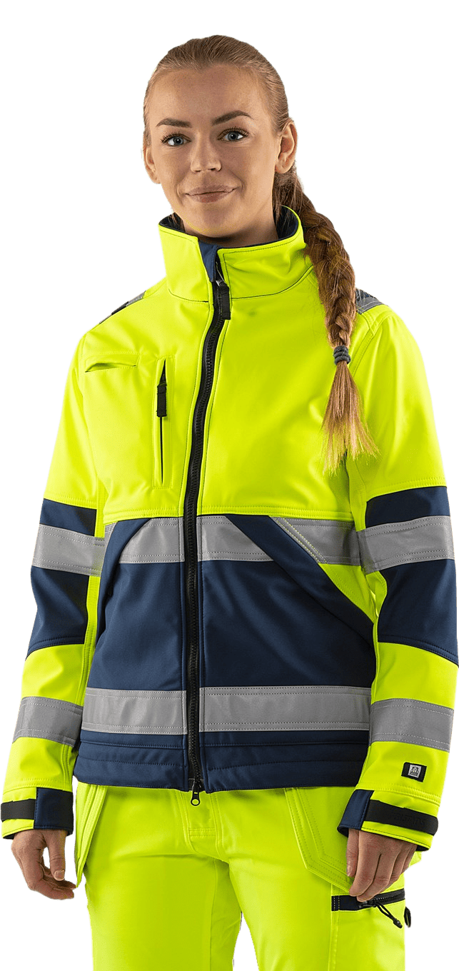 Näkyvä softshell-takki naisille. Tuulenpitävästä ja vettä hylkivästä joustavasta materiaalista valmistettu takki soveltuu lähes ympärivuotiseen käyttöön. Siirtymässä PFAS-vapaaksi
