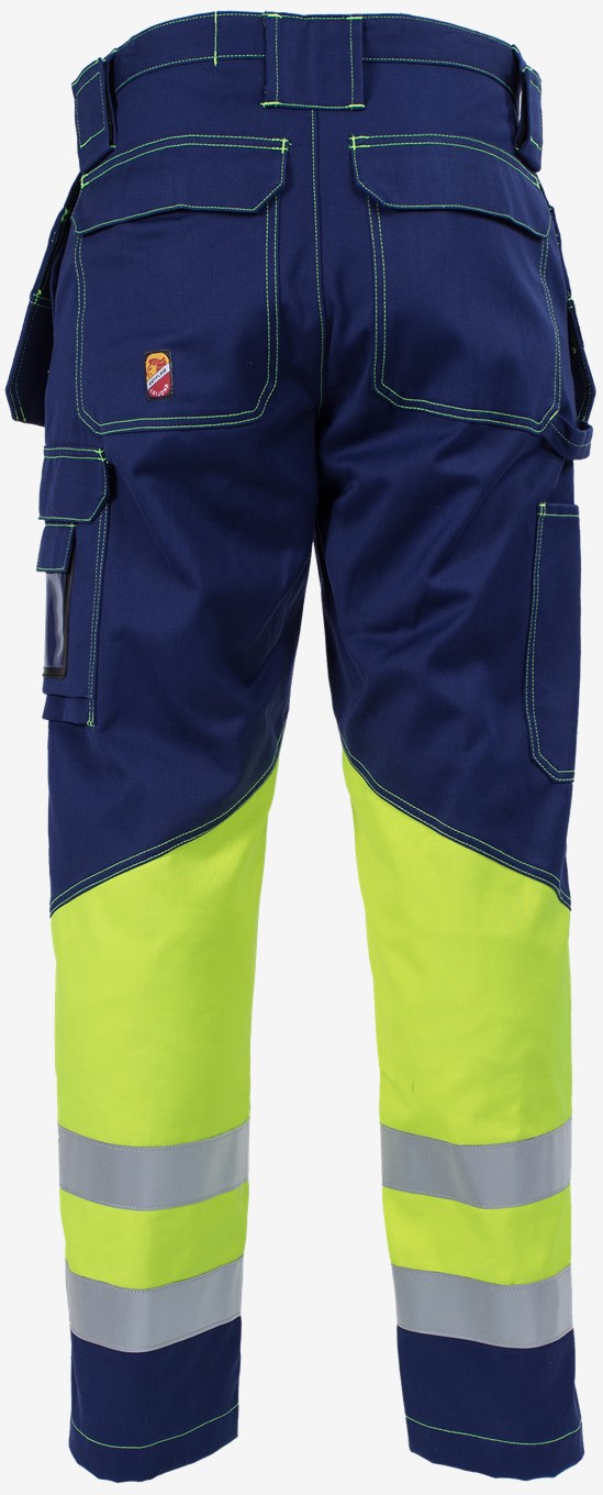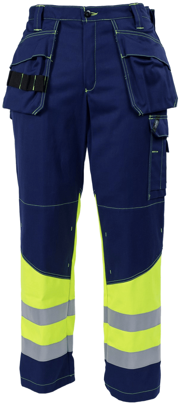 Näkyvät palosuojatut riipputaskuhousut työhön, jossa tarvitaan palosuojauksen lisäksi hyvää näkyvyyttä. Housut on hyväksytty myös hitsaukseen. Housuissa on sisäpuoliset polvisuojataskut sekä kannelliset mitta- ja reisitaskut.