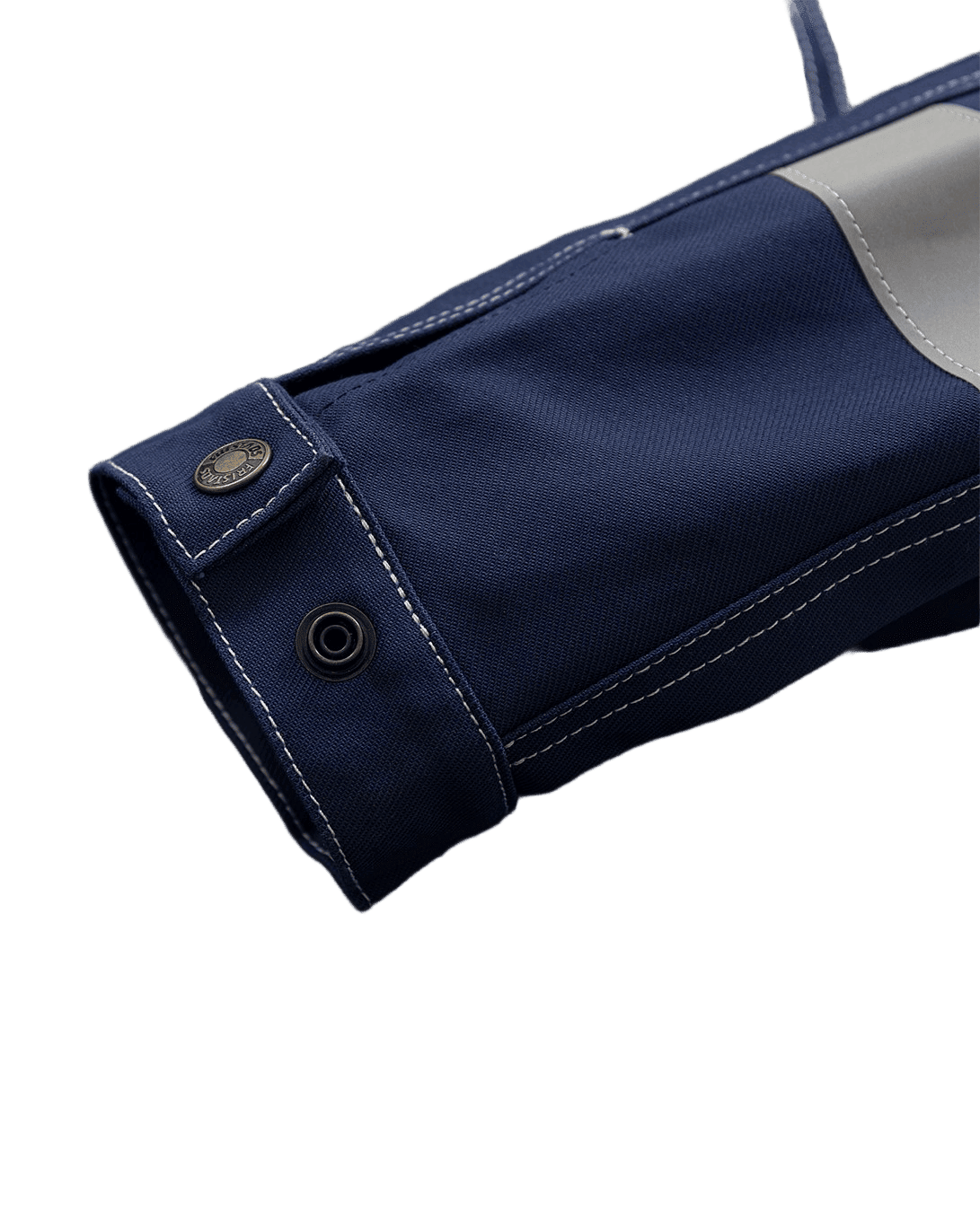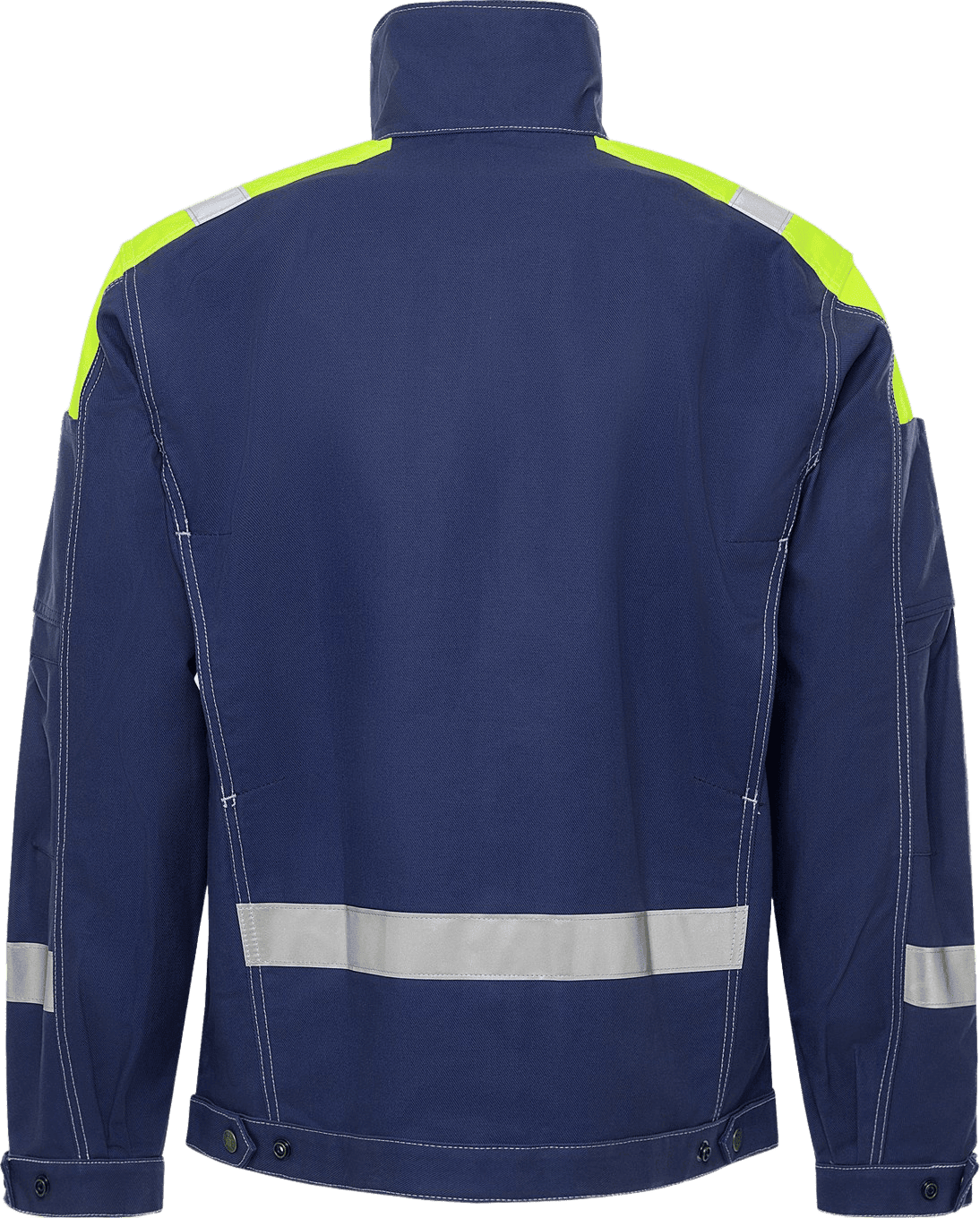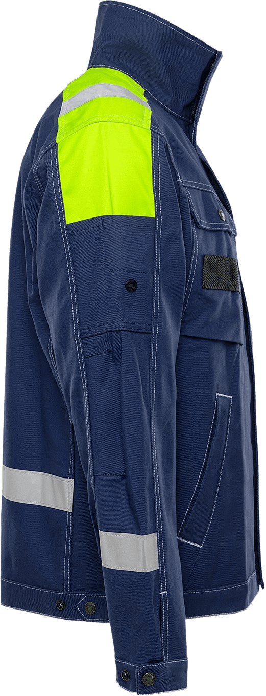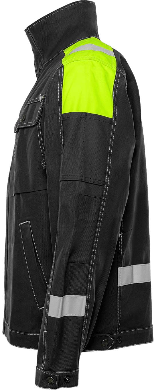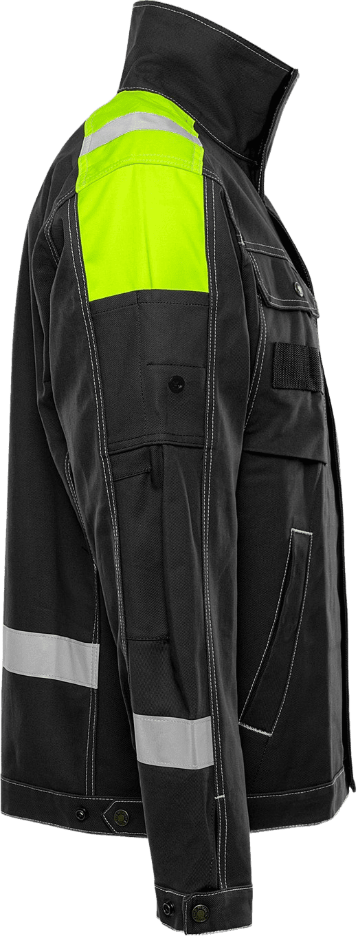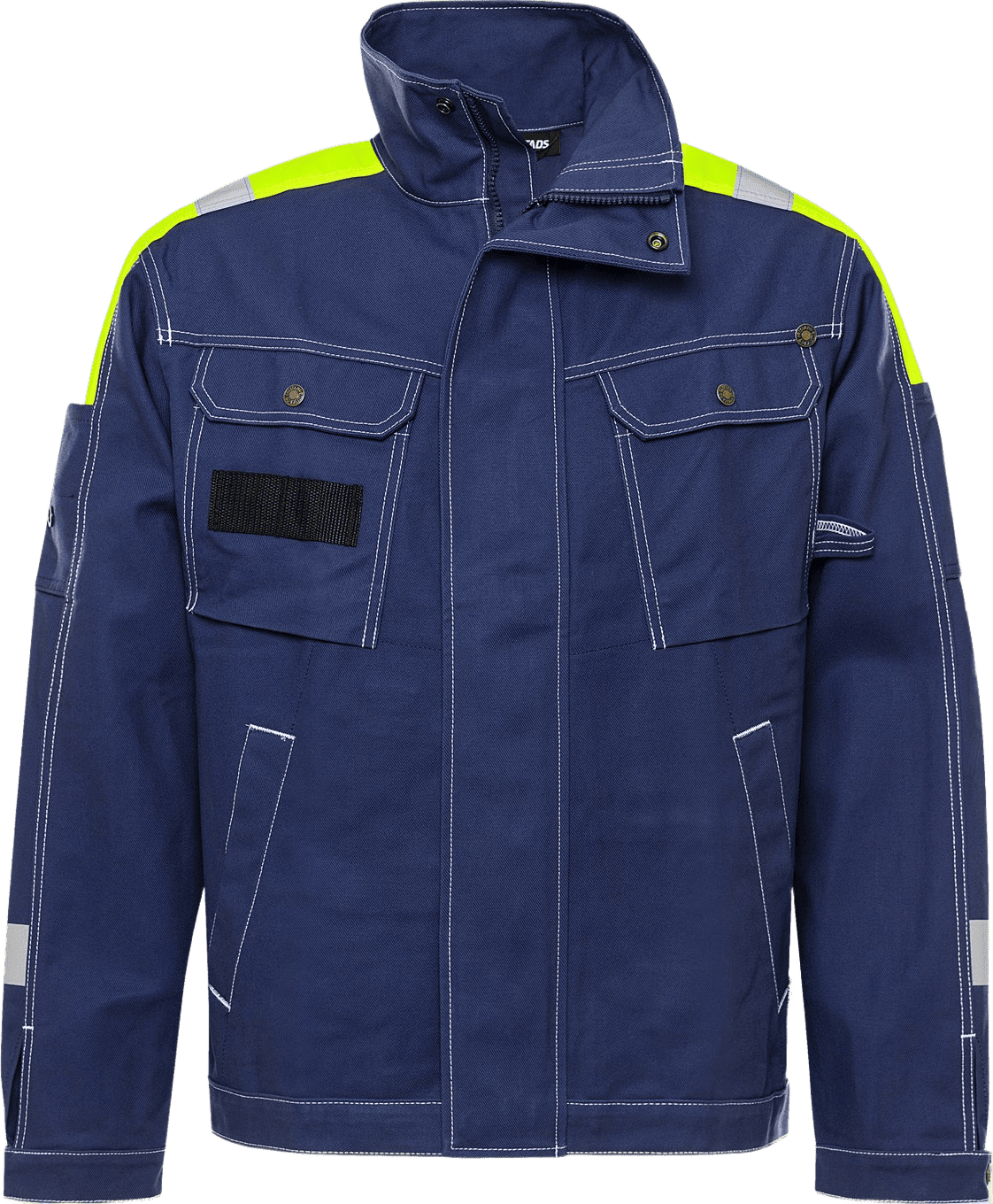 Kestävä rakentajan takki 100% FAS®-puuvillasta piilotetulla etuketjulla, useilla taskuilla ja neonkeltaisilla paneeleilla. Siirtymässä PFAS-vapaaksi. Konsepti: Classics